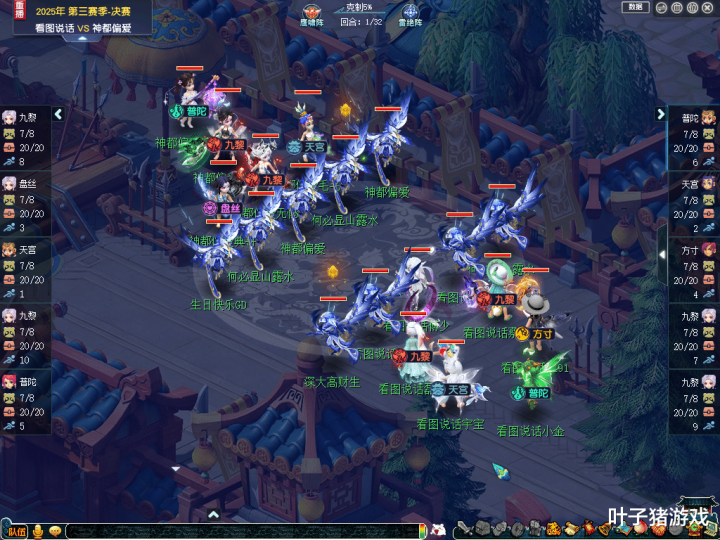 进入比赛后,【看图说话】选用了“普陀、天宫、方寸、双九黎”组成的“双封面伤”阵容;【神都偏爱】则是采用了“双九黎、盘丝、天宫、普陀”组成的“双封面伤阵容。由于【神都偏爱】拿到了全场一速、三速,所以【看图说话】的封系节奏并不算好。