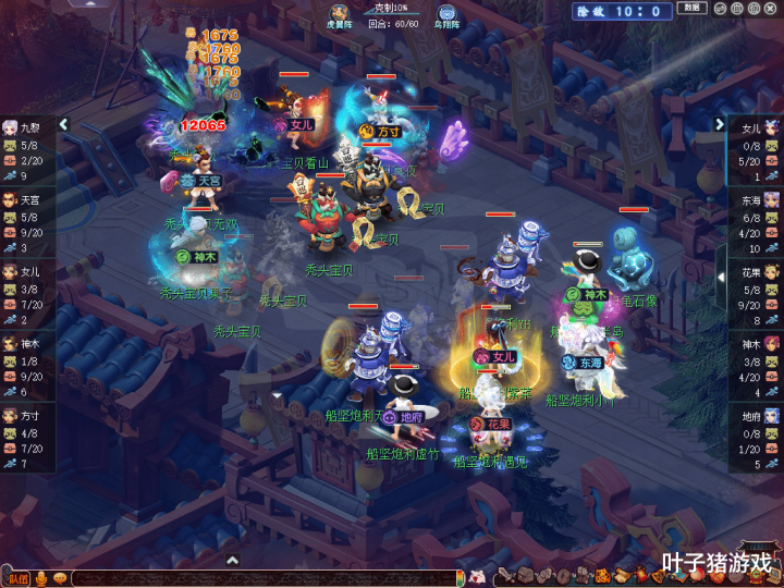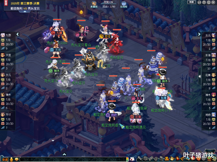 进入比赛后,【船坚炮利】选用了“女儿、东海、花果、辅助神木、地府”组成的“点杀”阵容;【秃头宝贝】则是采用了“九黎、天宫、女儿、辅助神木、方寸”组成的“四保一”阵容。